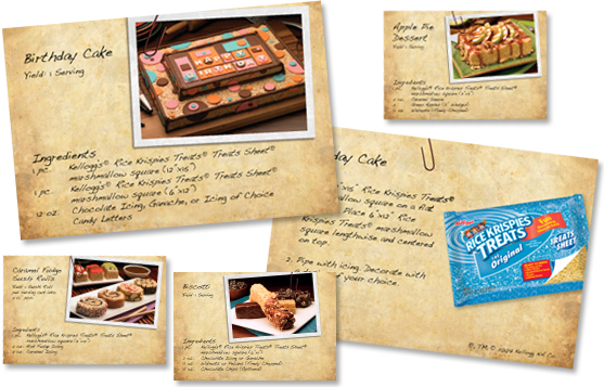 Series of four Recipe Idea Cards for Kellogg's® Rice Krispies Treats® Treats Sheet® foodservice point-of-sale displays.