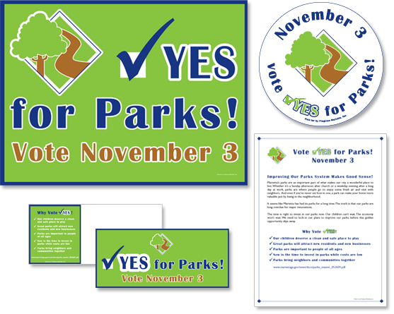 Signs, postcards, stickers and flyers were distributed to residents and dotted the landscape of Marietta, GA encouraging them to vote YES! for the Parks Bond. UPDATE: The Parks Bond passed!