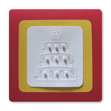 Cards :: Wedding 03 Vibrant colored papers layered, featuring an embossed wedding cake embellished with miniature faux pearls and glitter.