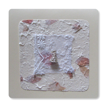 Cards :: Wedding 05 Handmade paper embedded with rose petals and lace sewn together, featuring a removable wedding cake charm.